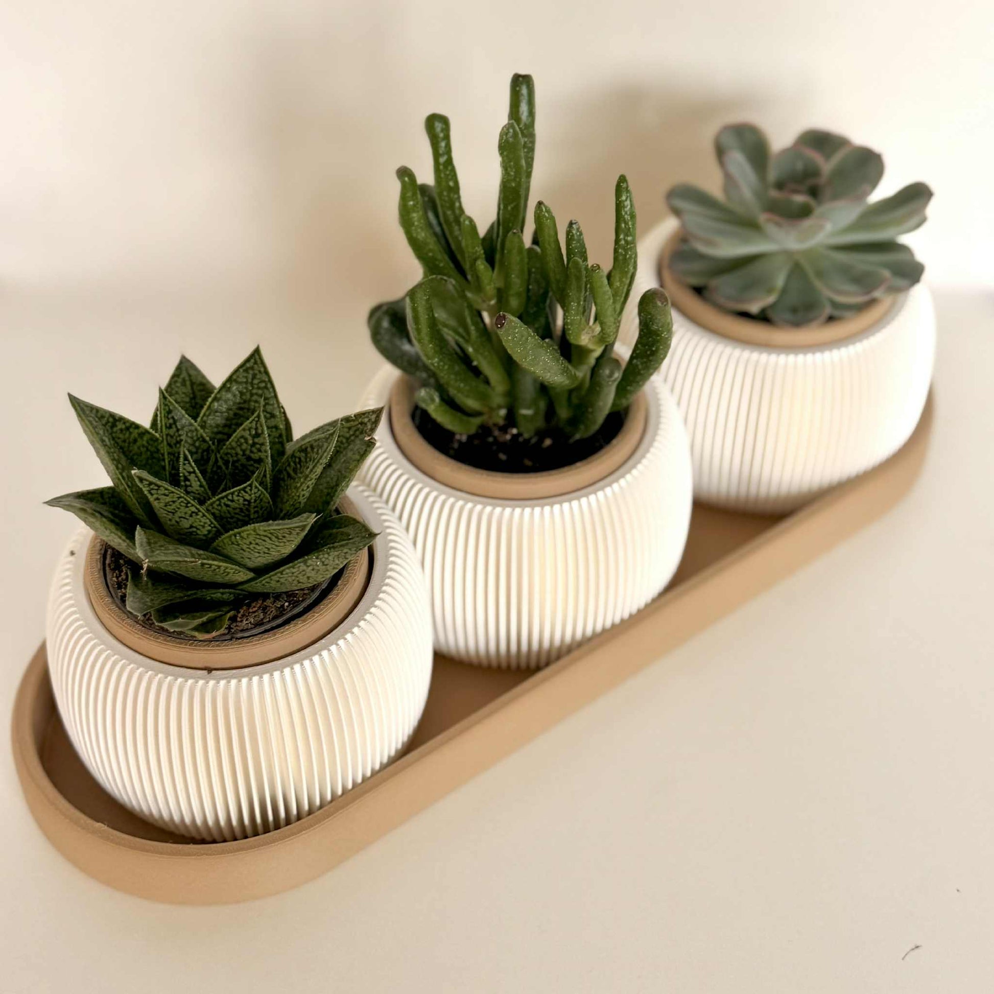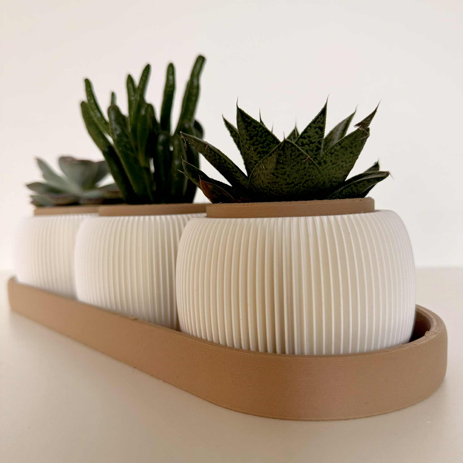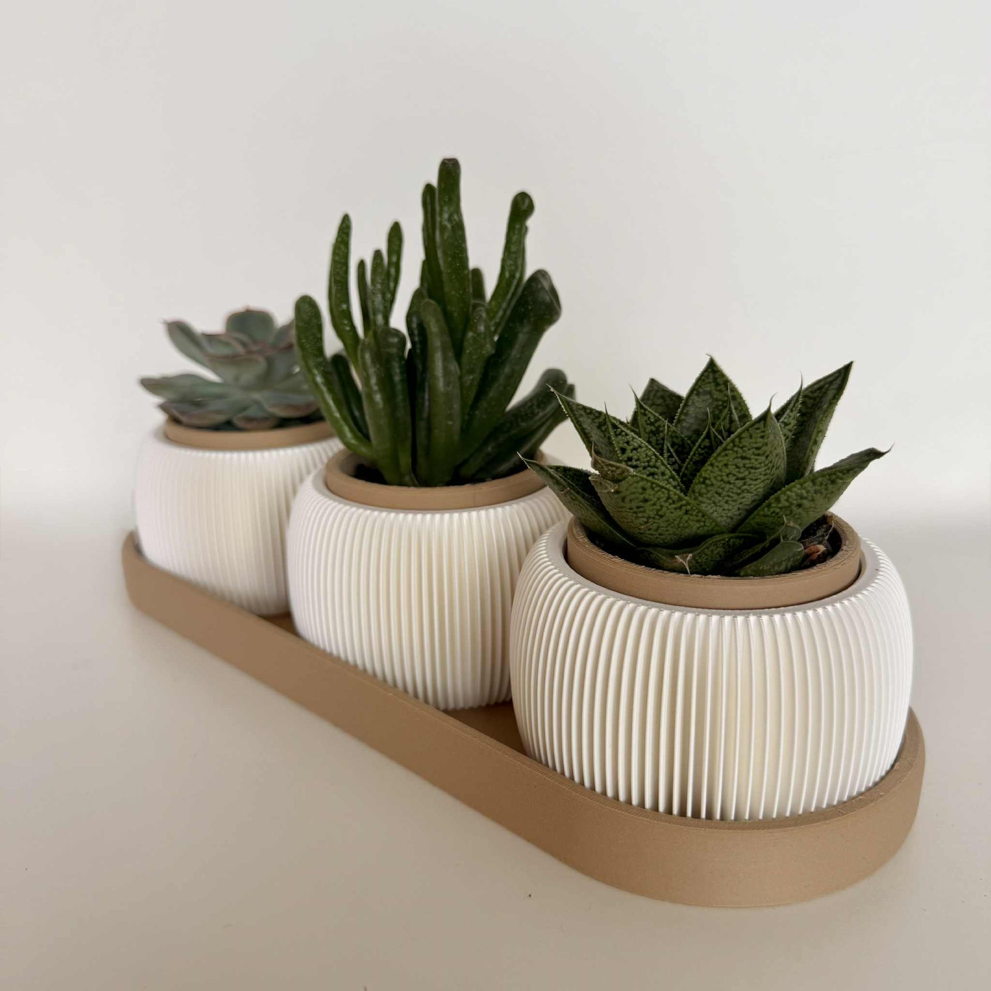 Gi interiøret ditt et moderne og elegant preg med dette stilfulle settet av potter med matchende brett. De hvite pottene har et vakkert rillet mønster som gir et tidløst uttrykk og passer perfekt til små planter som sukkulenter, kaktuser eller urter.