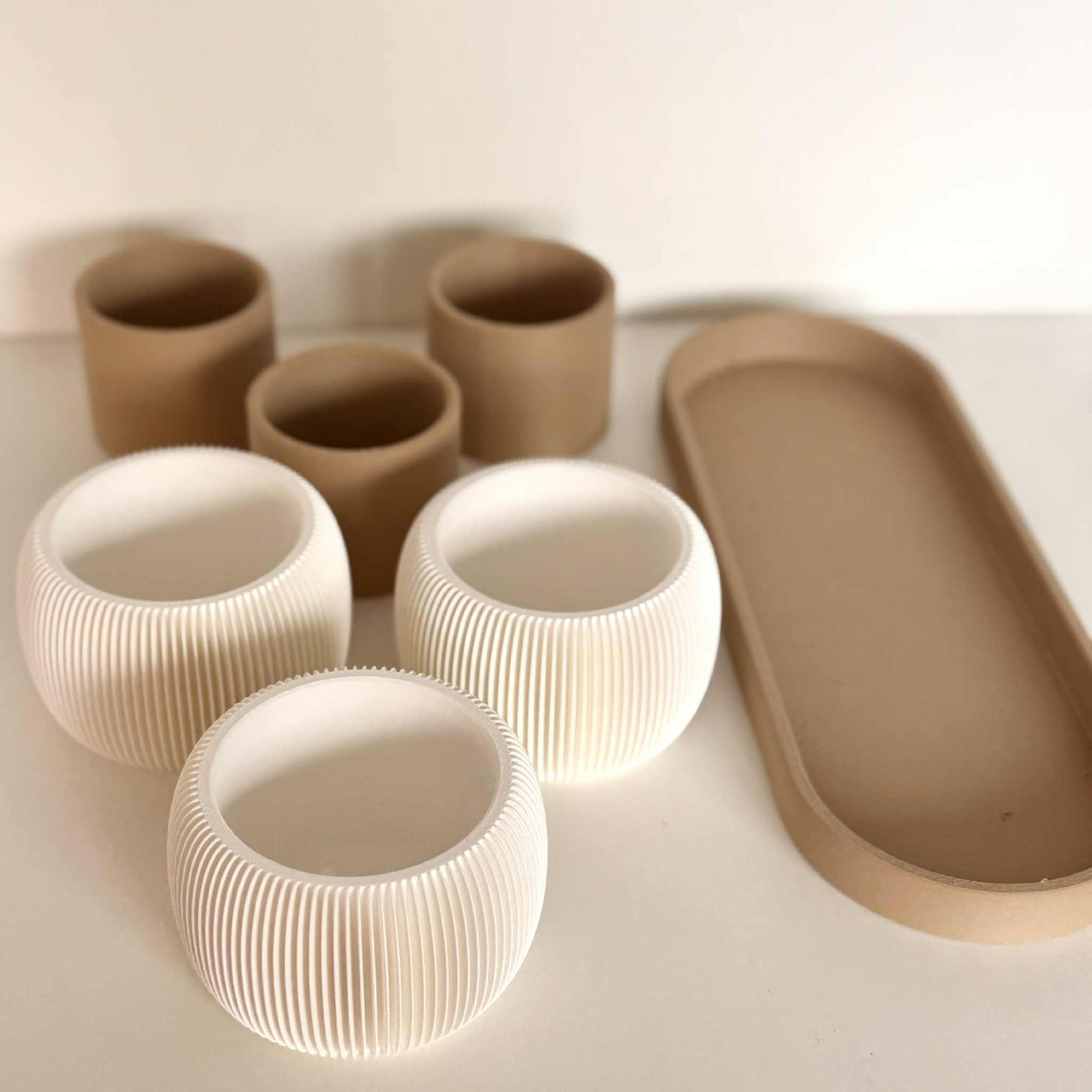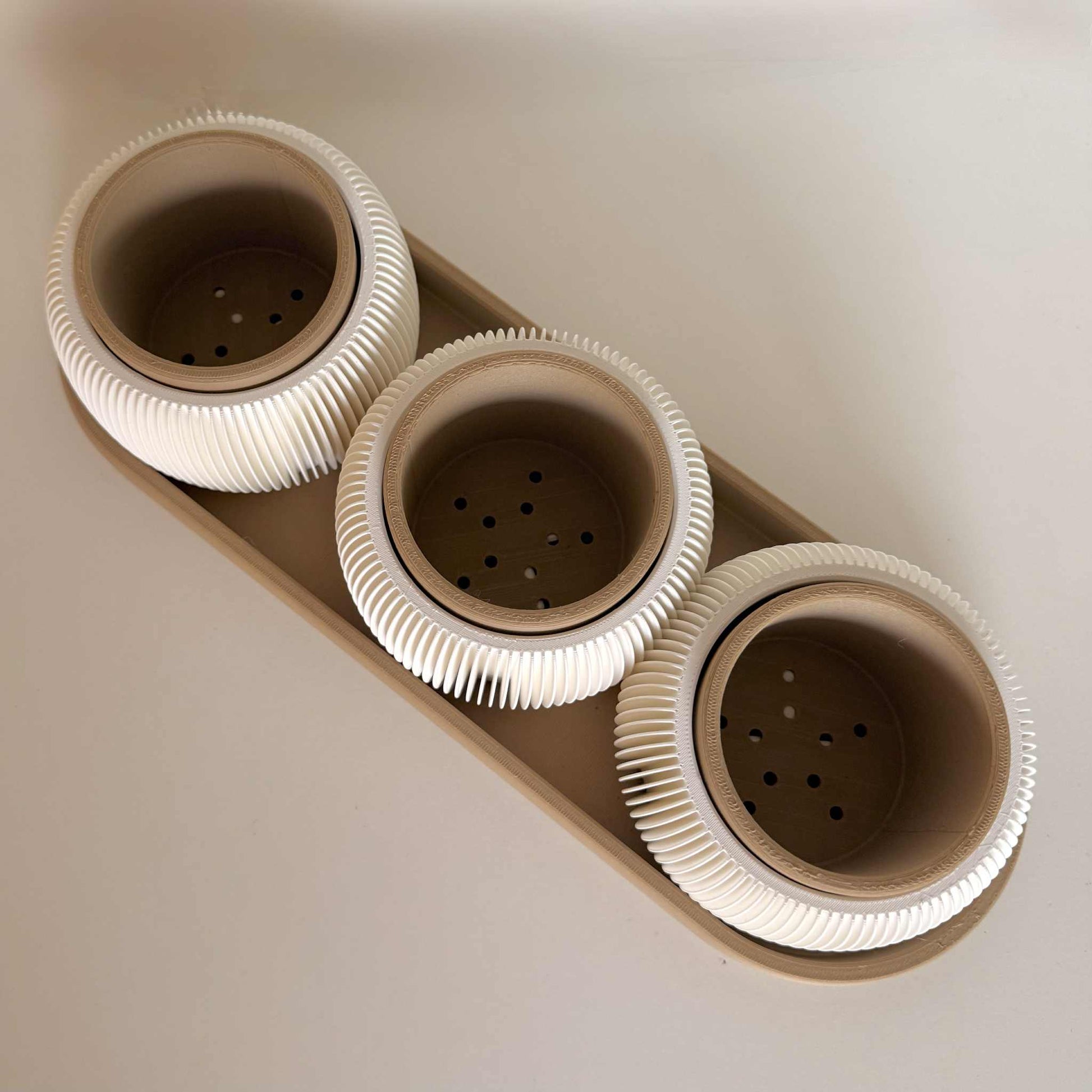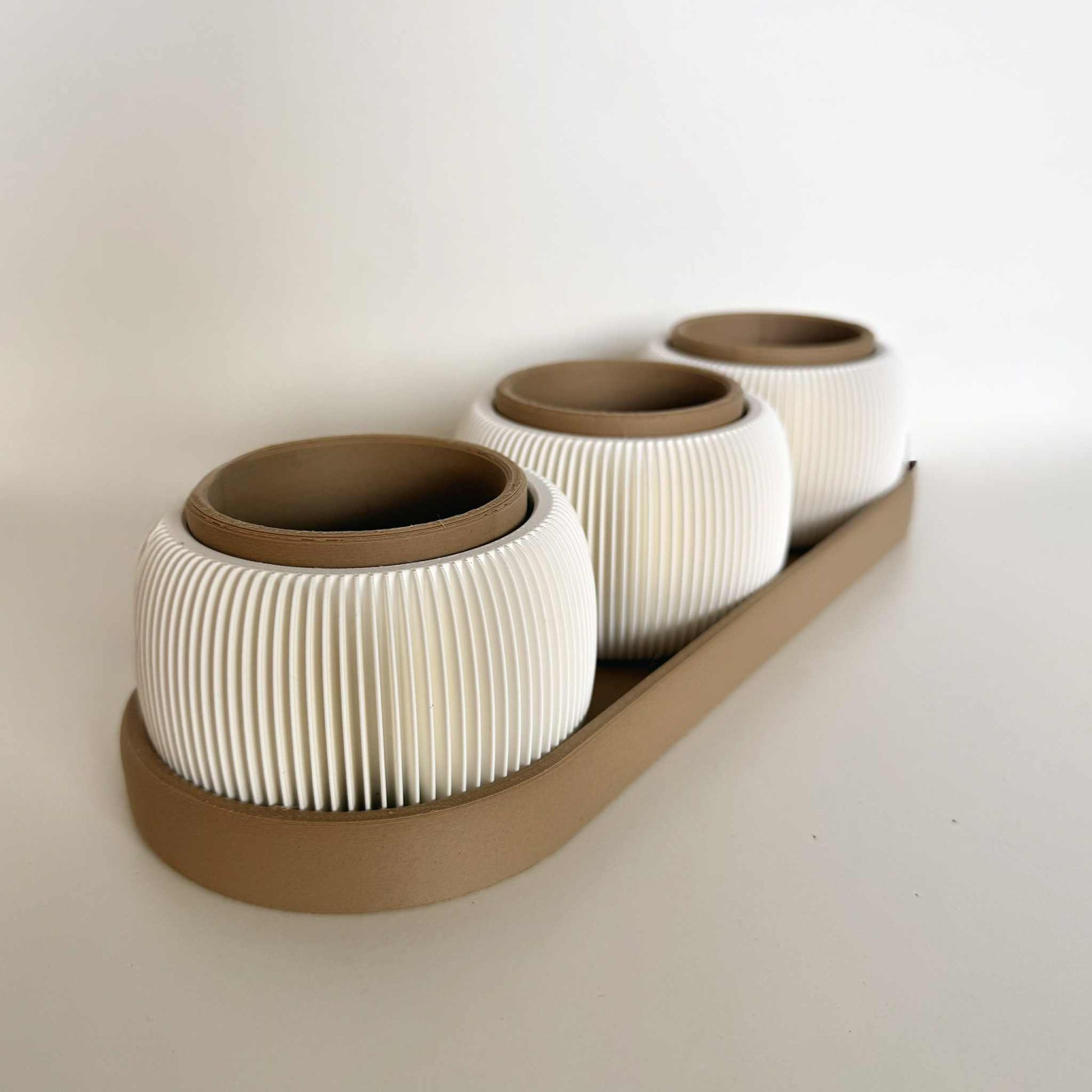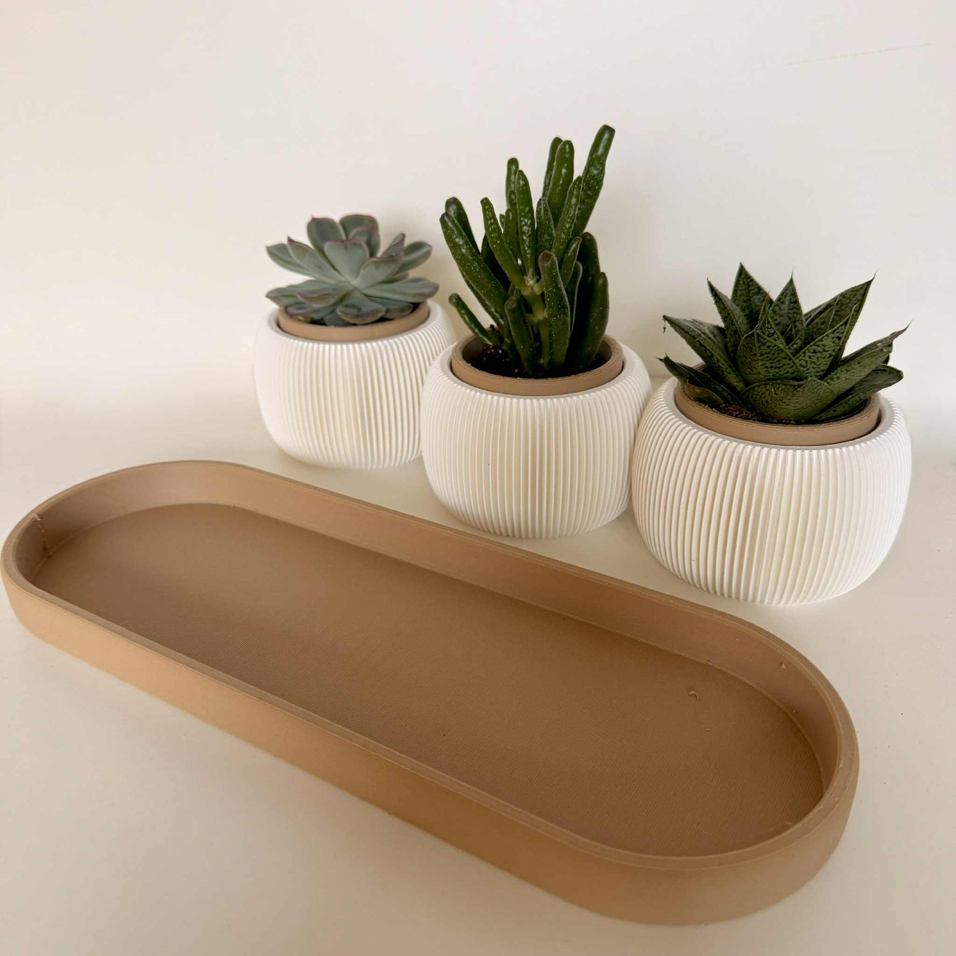 Gi interiøret ditt et moderne og elegant preg med dette stilfulle settet av potter med matchende brett. De hvite pottene har et vakkert rillet mønster som gir et tidløst uttrykk og passer perfekt til små planter som sukkulenter, kaktuser eller urter.